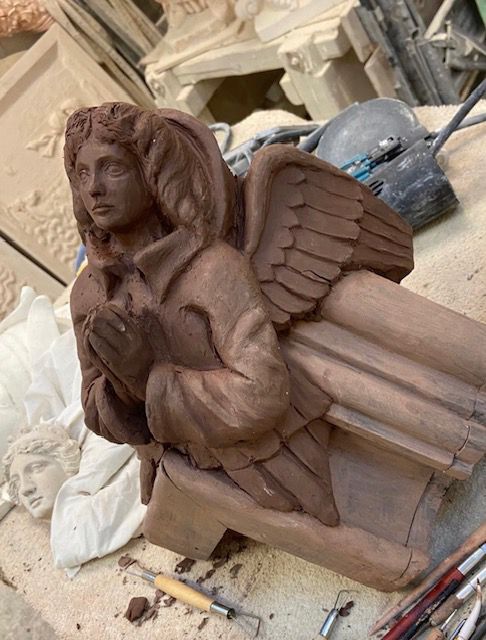 Clay models are bing produced for the grotesque figure designs. The architect will review these in early September for the stone carving to commence.